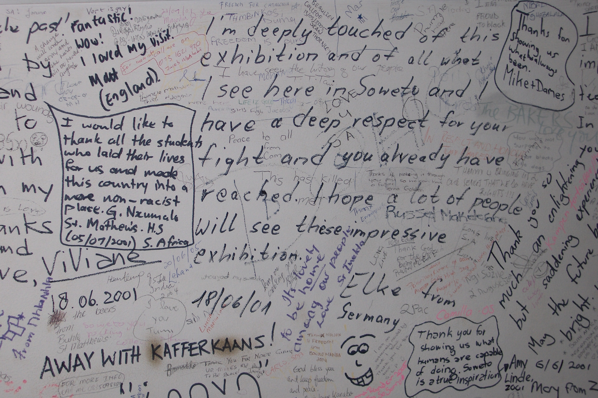 While the church has no significance architecturally (vintage 1950s or 1960s style) walking into this place sends chills down one’s spine as though one were entering Notre Dame in Paris. I think Regina Mundi has as much history as Notre Dame except that it is crammed into 50 years instead of 900. Inside, one finds scars of police raids in the 1980s when white police officers stormed the church and fired shots into the ceilings and walls. Our guide lifted the linen off the altar to reveal a large chunk of missing marble – the result of an angry police officer who struck the altar with his billy club. Upstairs, where one would normally find a choir loft, was a remarkable photo gallery of a famous South African photographer who chronicled the history of the struggle over a 50-year period with his camera. We were fascinated by these photos, so much so that our guide Mandy had to come and find us and drag us out because we were dawdling too much.