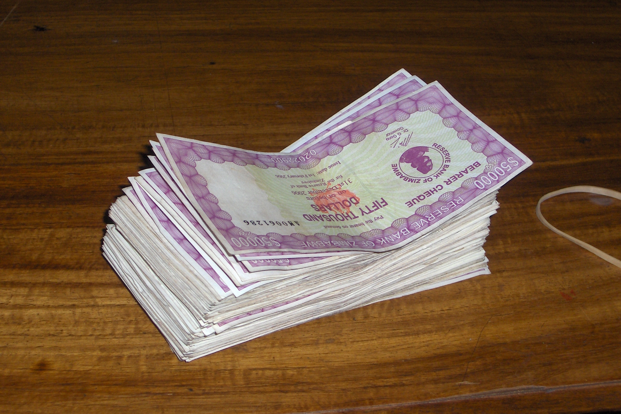 More common are $50,000 notes. To put this in perspective, $20 US exchanged will get you a stack of Zim dollars the size of a brick. Line-ups in grocery stores are not caused by too many customers, but because it takes soooooo long to count the money. I was told by a Brit visiting here who helped a friend fix a car that when the bill came, they actually tacked on an additional hour of “labour” because of the time it takes to count the money. People walk around with huge wads of cash on them. At any given time, I have at least a million in each front pocket, another couple of million in my money belt, another stack in my small napsack and another pile left behind in my hotel room because I JUST CAN’T CARRY IT ALL!!! If someone steals it, WHO CARES??? It’s probably only worth $5 or $10 US anyway!!! Imagine how useless a show called “Who wants to be a millionaire” would be here!!! They’re all freakin’ millionaires!