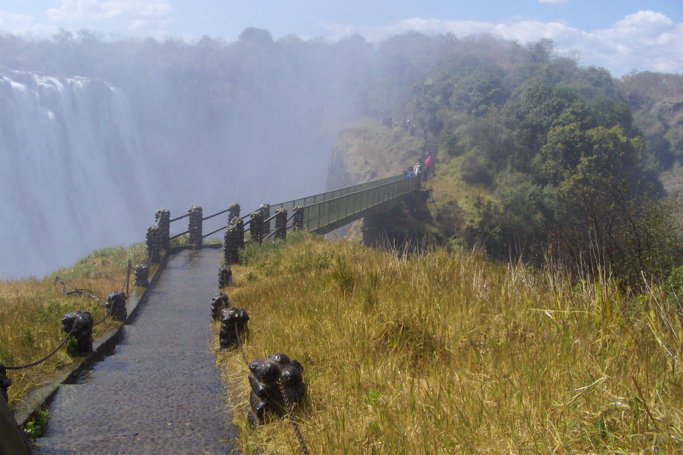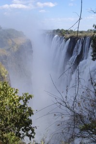 The Zambian side offers a brilliant and wet view…directly across from them. It seem you could almost reach out and touch them, when in reality you are a few hundred metres away. The spray off them is like rain, but the rain is actually falling up! There is a footbridge that allows you to look down into the gorge and get really rained on. There are rainbows everywhere it seems and the vegetation turns from dry woodland to actual rainforest, with giant ferns and lush green everywhere.