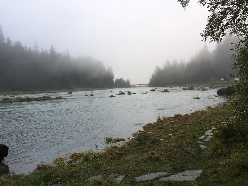 Next morning I got up early as I knew the sockeye salmon were running and, where there be salmon, there be bears. I made my way to the nearby river to check it out. Now if you’re going to deliberately put yourself in eyeshot of a grizzly, do it when they are fat on salmon. The grizzlies are happy and don’t bother anybody so long as you don’t get all paparazzi on them. I saw a total of six grizzlies but all of them in the fog and way beyond the range of any camera shot (so I could just be making all this up as I have no proof). As for the salmon, they’re cool to watch too. They congregate by the hundreds behind rocks in the river, waiting to recover enough energy to run the next set of rapids. You can almost touch them. It is in this scene that they are the easiest of pickings for bald eagles and grizzlies, and why the former and the latter are numerous in the Alaska panhandle.