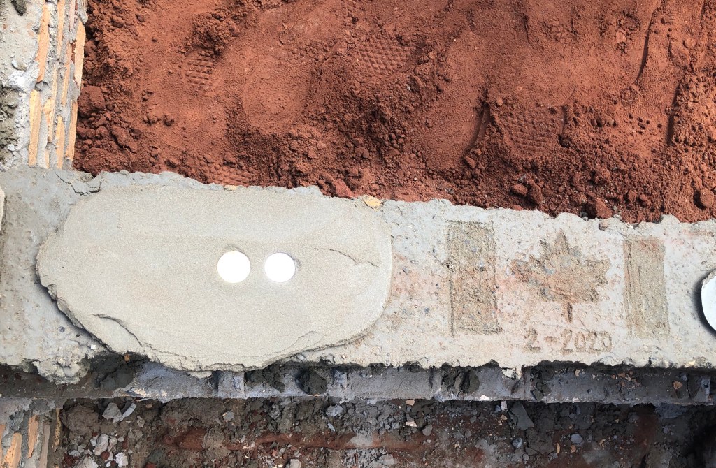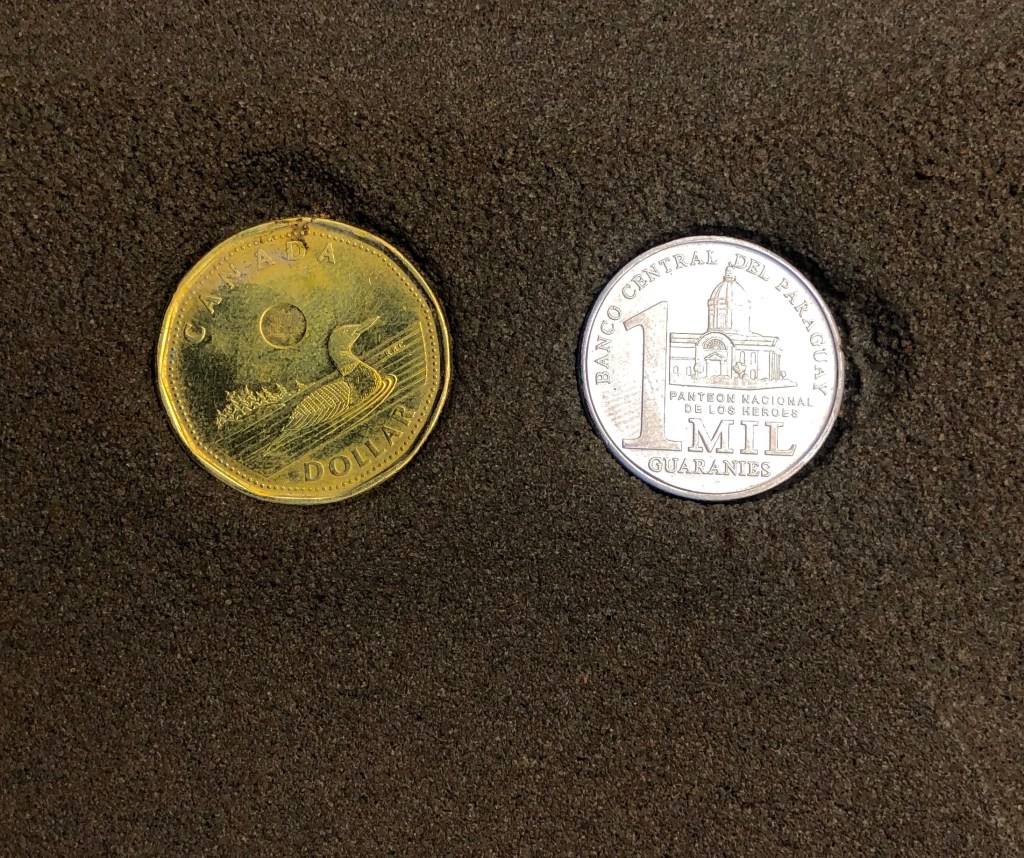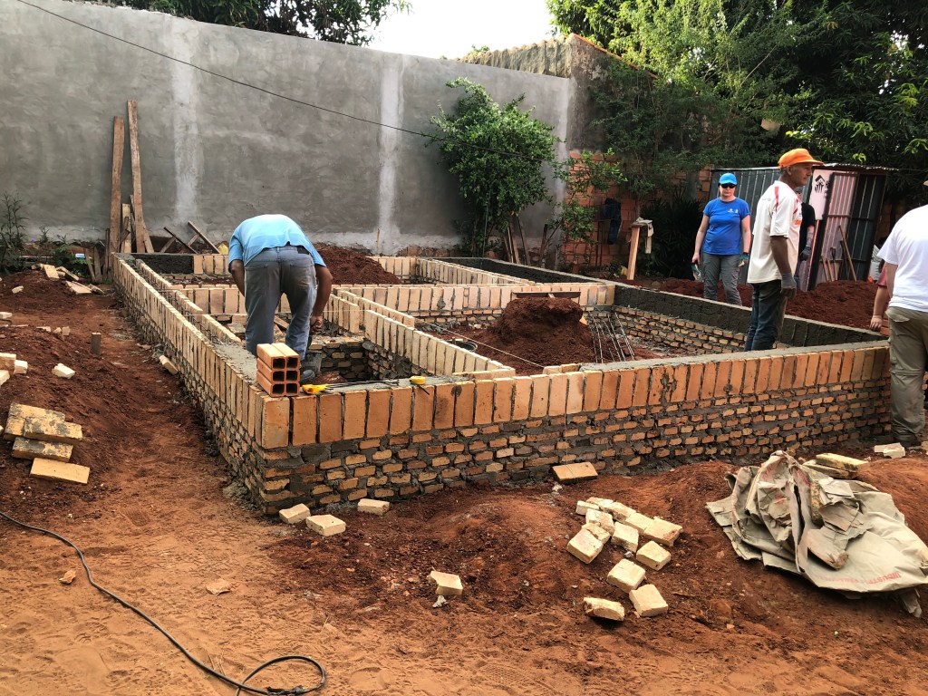 As a little symbolic gesture to the Acostas we placed a loonie in the foundation. They in turn put a 1000 guarani coin mext to it. One of our volunteers drew a Canadian flag in the wet mortar. Once the front door frame is installed these little symbols will be forever buried from view.