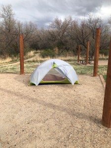 Saturday night was our first camping night of the trip. We arrived at Jackson Lake State Park in eastern Colorado just as the temperature was peaking at 32C and red alert wind storm began. We were a big concerned a severe thunderstorm would hit but we managed to set up the tent anyway. We also cooked our pasta dinner in 80km/h winds which likely gave comic relief to our neighbours hiding in their vehicles. By the time we finished dinner the temperature had fallen to 12C. No question of a campfire that night so we went to bed at 8:00 with the wind still howling. We woke up to find the world still intact though a brisk 7C.