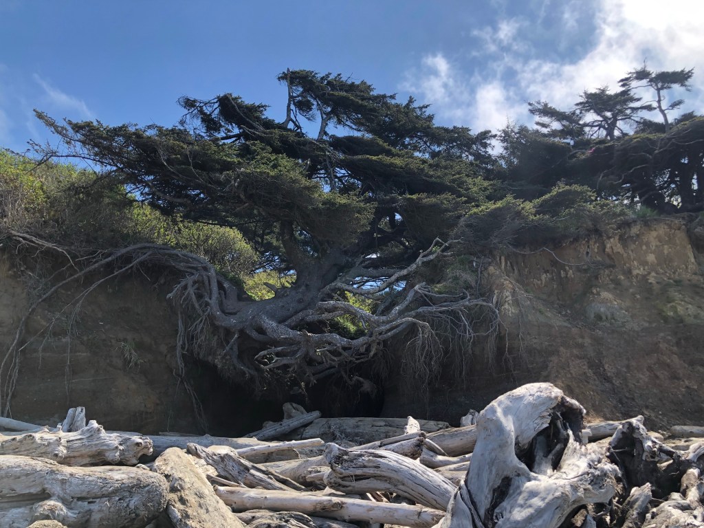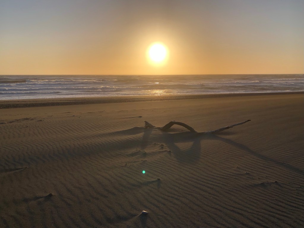 Our campsite that night was at Golden Bluff Beach just outside the national park and 10 km off US101 on a twisty pot holed road. We arrived at dusk to find the beach in the throes of a rather significant windstorm. The campground was fully booked that night but evidently many campers never showed or stayed. We were fortunate to have reserved a site that backed onto the woods so we set up the tent in a clearing in the forest fully protected from the wind. We spent a glorious evening exploring the windy seashore before retiring to our shelter.