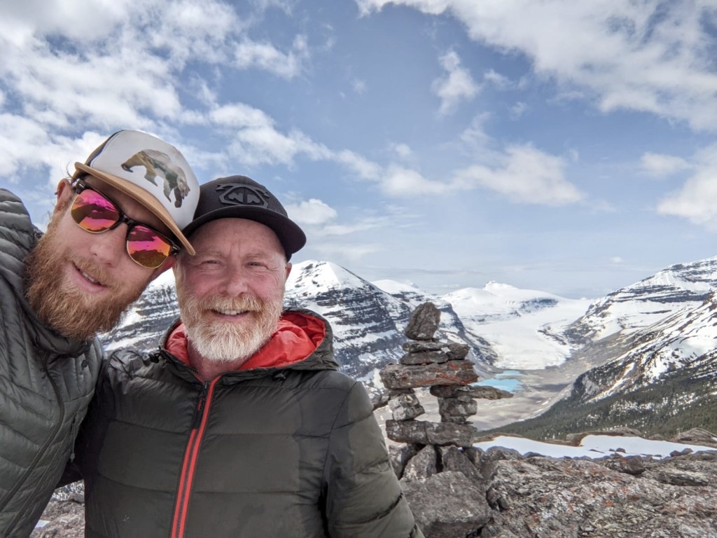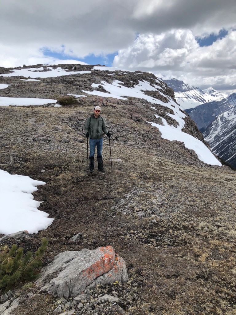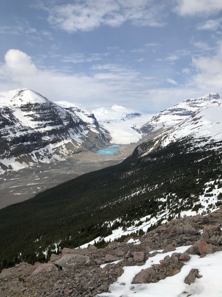We decided to do the Parker Ridge Trail whose trailhead bulletin board warned users of possible avalanches. The trailhead at this time of year is still above the snow line so we put on our boots and gators and steadied ouselves in the snow pack with hiking poles. In some areas the snowpack would give way and you would sink to your hip in the snow. The trail was not more than 3.5 km to the summit but the elevation gain was 340 m. Fortunately about half way up the snowpack gave way to bare rock and muskeg that was much easier to manoeuvre on. From the top we got stunning views of the Saskatchewan Glacier.