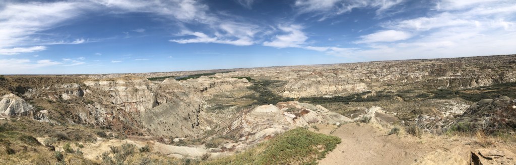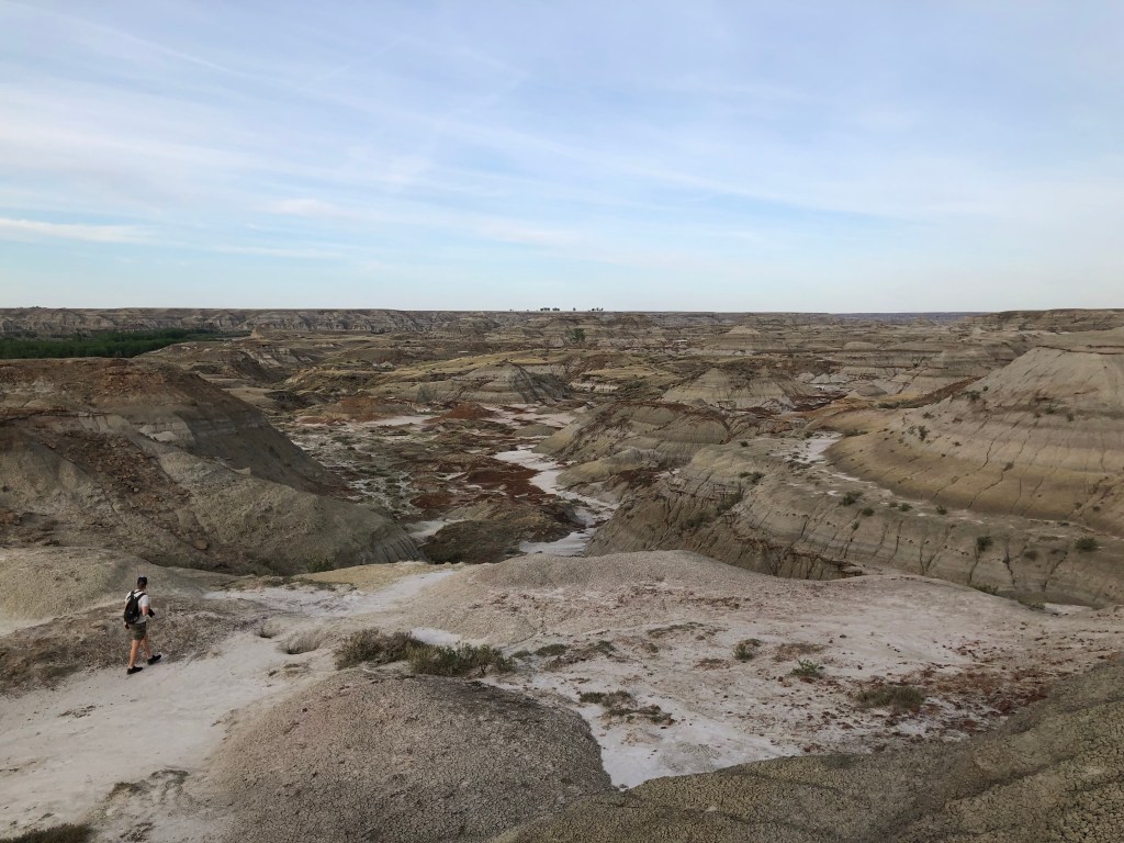 The following day we headed northeast leaving the Rockies behind for good. We stopped in Lethbridge for a quick service appointment on the car and then made our way to Dinosaur Provincial Park near Brooks, where we would camp in the Alberta badlands in a grove of Cottonwood trees. The drive to the park was typical prairie landscape until you suddenly reach the moonlike mounds and canyons of the badlands. Dinosaur Park has the largest collection of upper cretaceous dinosaur fossils in the world, netting it UNESCO world heritage status. We spent the evening exploring the hills around the campground.