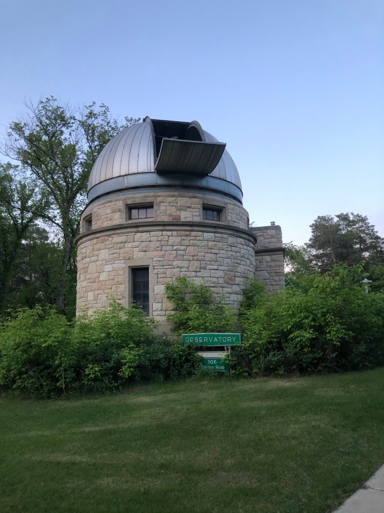 We had a great meal of tacos and beer at Shelter Brewery and then walked across the bridge to the University of Saskatchewan, where the century-old observatory was having an open house for the evening. What better way to spend a Saturday evening? The students gave a quick tour and we were invited to gaze at the moon through the antique telescope. The students actually have access to the university’s modern telescopes for serious stargazing but this one did the trick for the slackjawed tourists.